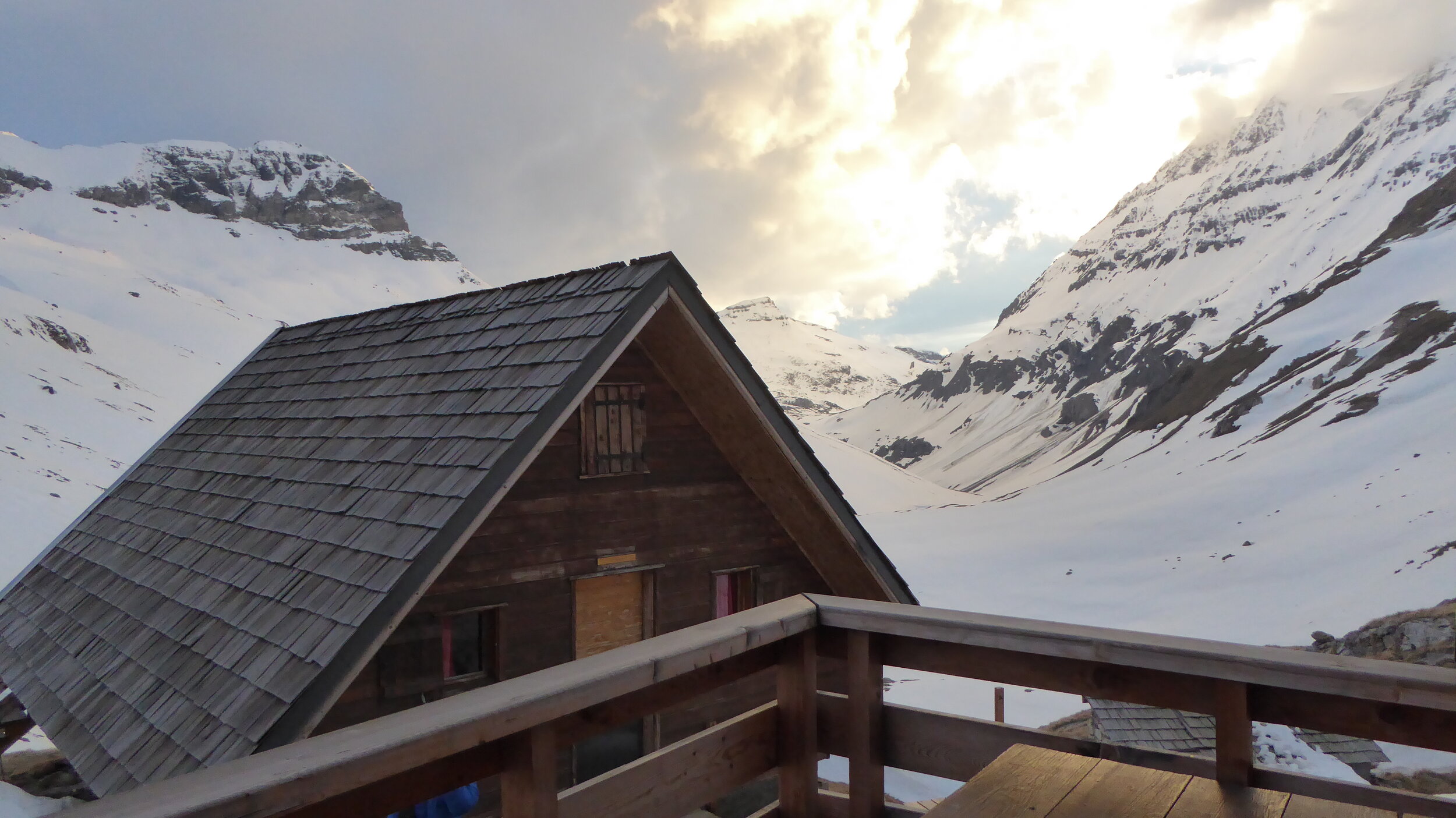 The fire crackles as some of the smaller pieces of wood ignite. The refuge is cold, but warmer than outside. The wind still howls, and the small window shake with each gust. The night is dark and full of terrors, or so your mind says, but inside, light and soon warmth.